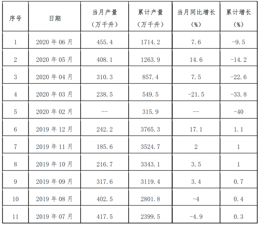 表 2 近一年中國(guó)白酒(折65度,商品量)產(chǎn)量及增速統(tǒng)計(jì)表